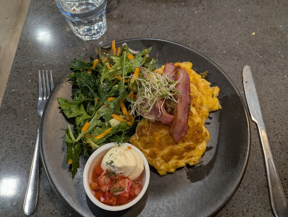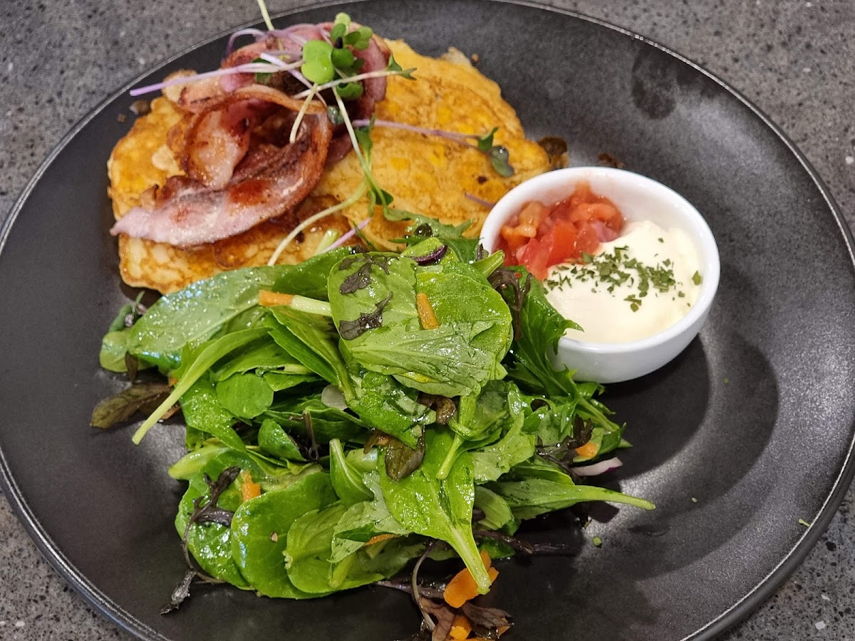 The menu strikes a balance between classic café fare and a few standout dishes that regularly draw appreciative nods from patrons. Coffee drinkers will find the Atomic Coffee and Matcha Latte noteworthy, with the coffee consistently described as well-crafted and satisfying. For a quick bite, choices like the Cheese Scone and Almond Croissant offer familiar café comforts, while those after something heartier often opt for the Teriyaki Burger or the Halloumi Bacon & Roasted Veg Focaccia. Corn Fritters with bacon and salad come across as a popular choice, providing a wholesome but not overly heavy option.