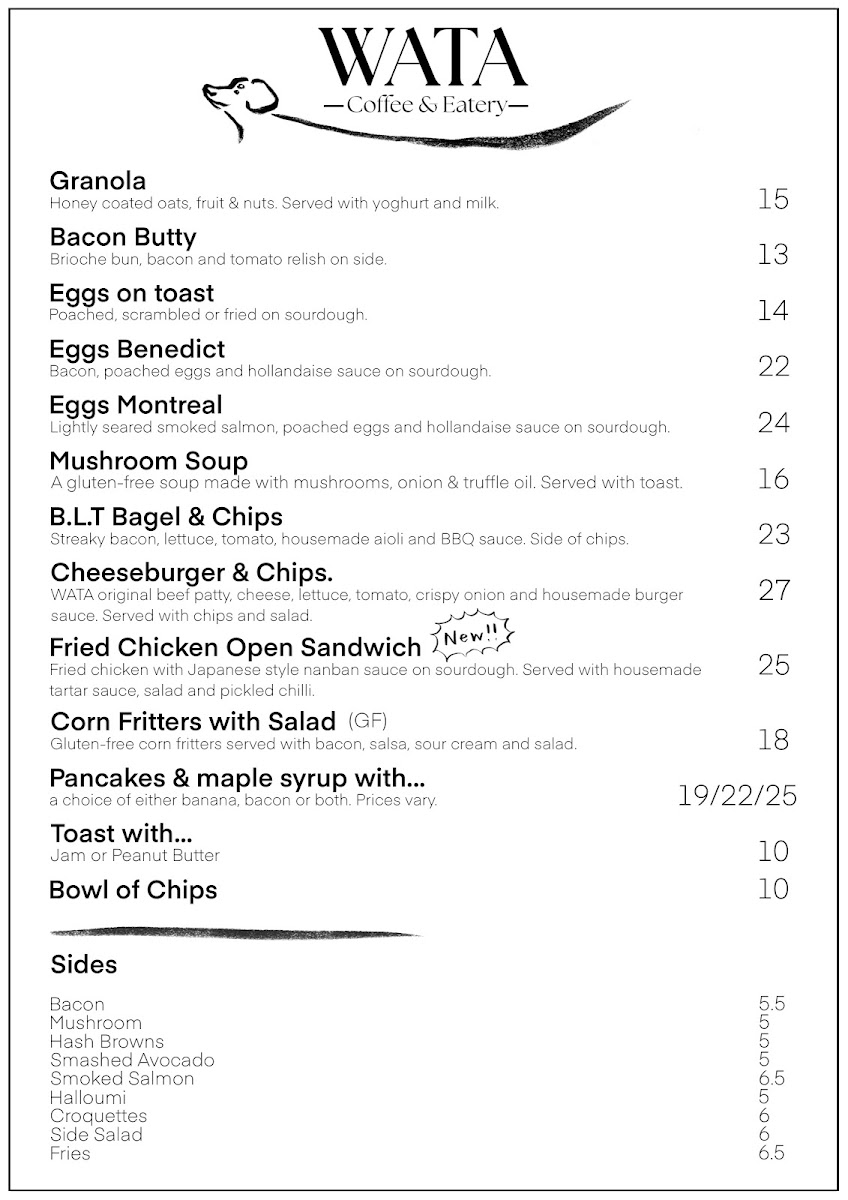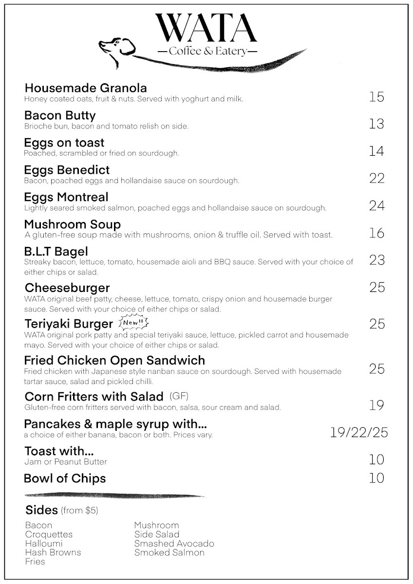 The menu at WATA Coffee & Eatery features a selection of coffee, light meals, and baked goods designed to suit various times of the day, including breakfast, coffee breaks, and casual dining. Visitors can find a range of hot and cold coffee options alongside specialty drinks such as matcha latte.
